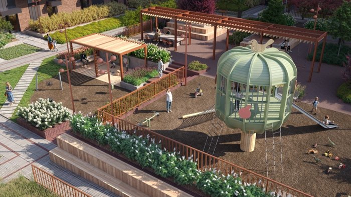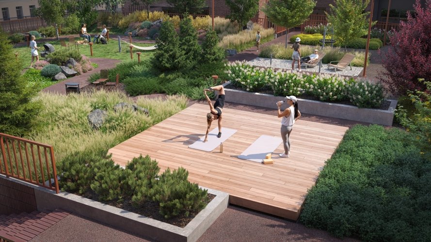 Детские площадки, зоны для йоги, прогулок и тихого отдыха позволяют каждому найти своё место. Двор работает и днём, и вечером — под ваше настроение.