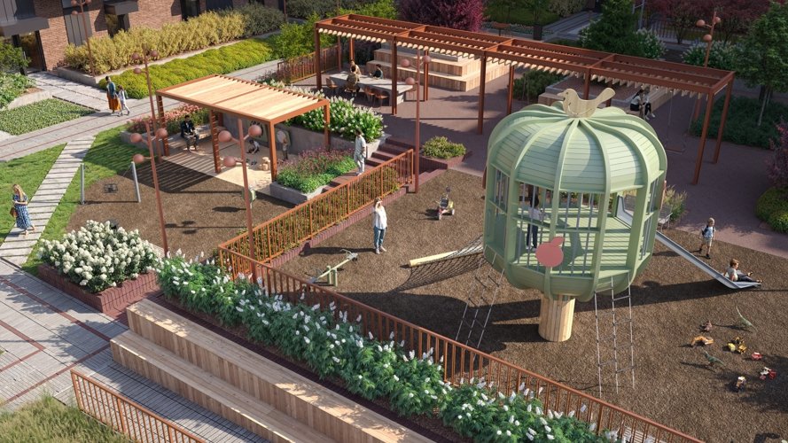 Озеленение с разными типами растений и дождевые сады создают ощущение природы в центре города. Даже зимой пространство не выглядит пустым и сохраняет уют.